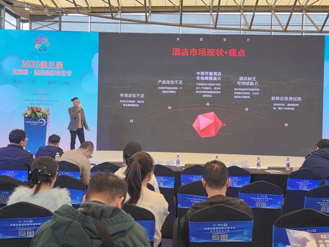 東哲設計創始人李造做了“存量酒店更新改造與設計”的主題演講,并以詳實的案例,講解了存量酒店改造應該輕硬裝、重策劃、重軟裝,并完善配套、優化房型強化體驗。